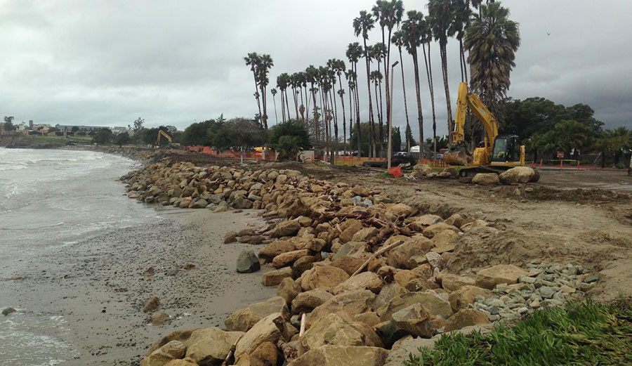 Installing large boulders as rip rap to armor the shore against further erosion at Goleta Beach in Southern California. The tide is very low (negative). Daniel Hoover/U.S. Geological Survey
