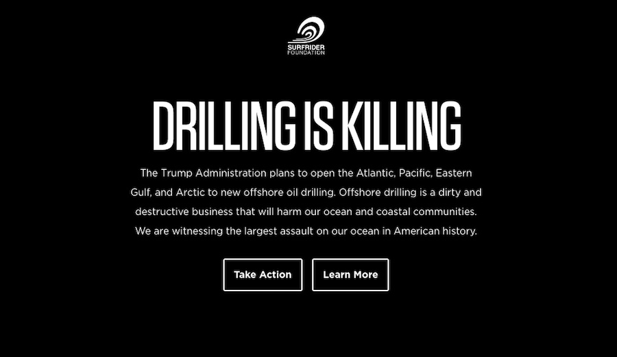 In a nod to Patagonia whose homepage turned an ominous black with the words “The President stole your land,” following an announcement to shrink several national monuments late last year, the Surfrider Foundation’s website has now gone black and reads, “Drilling is killing.”