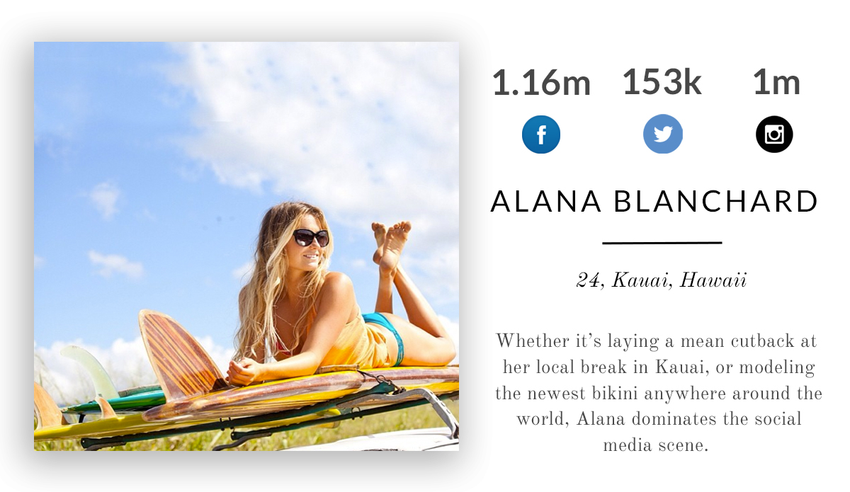 Alana. She’s got it going on. Whether it’s laying a mean cutback at her local break in Kauai, or modeling the newest bikini anywhere around the world, Alana dominates the social media scene.