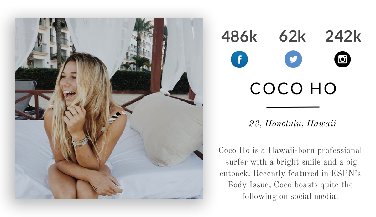 Coco Ho is a Hawaii-born professional surfer with a bright smile and a big cutback. Recently featured in ESPN’s Body Issue, Coco boasts quite the following on social media.