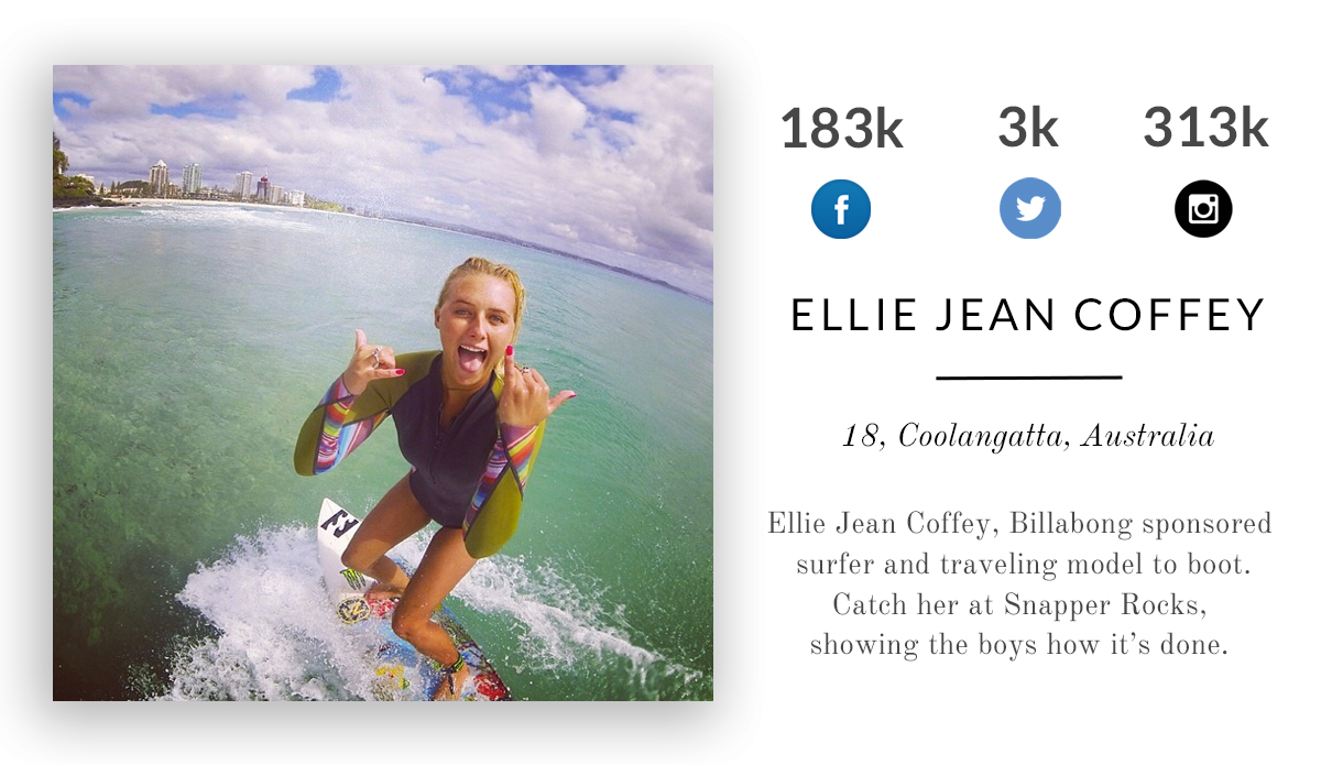 Ellie Jean Coffey, Billabong sponsored surfer and traveling model to boot. Catch her at Snapper Rocks, showing the boys how it’s done.