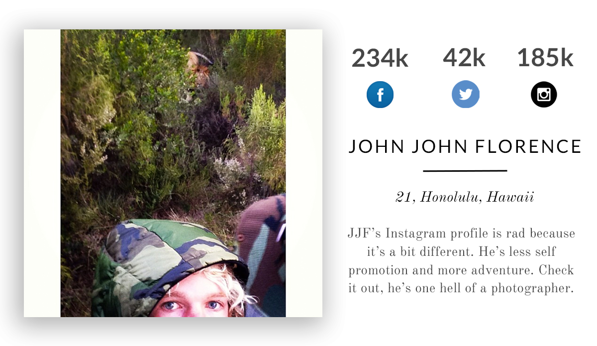 John John’s Instagram profile is rad because it’s a bit different. He’s less about self promotion and more about sharing his adventures with the world. Check it out. He’s one hell of a photographer.