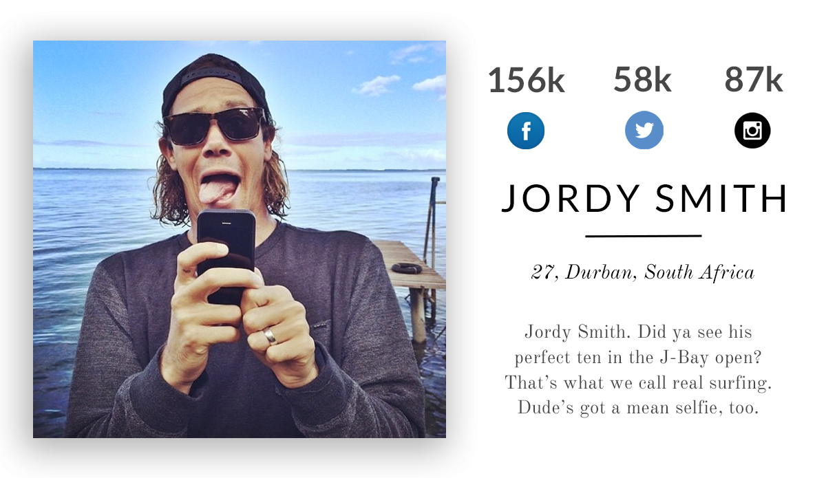 Jordy Smith. Did ya see his perfect ten in the J-Bay Open? That’s what we call real surfing. Dude’s got a mean selfie, too.