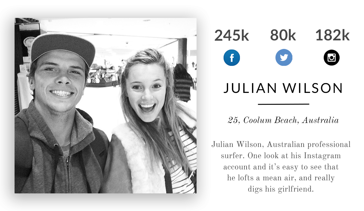 Julian Wilson, Australian professional surfer. One look at his Instagram account and it’s easy to see that he lofts a mean air, and really digs his girlfriend.