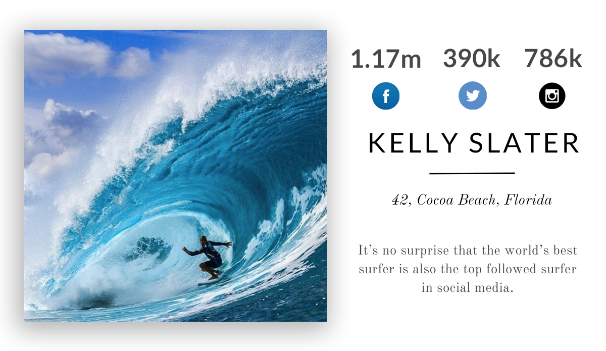 Here’s a list of the top twenty most popular surfers in social media, weighted by total followers.