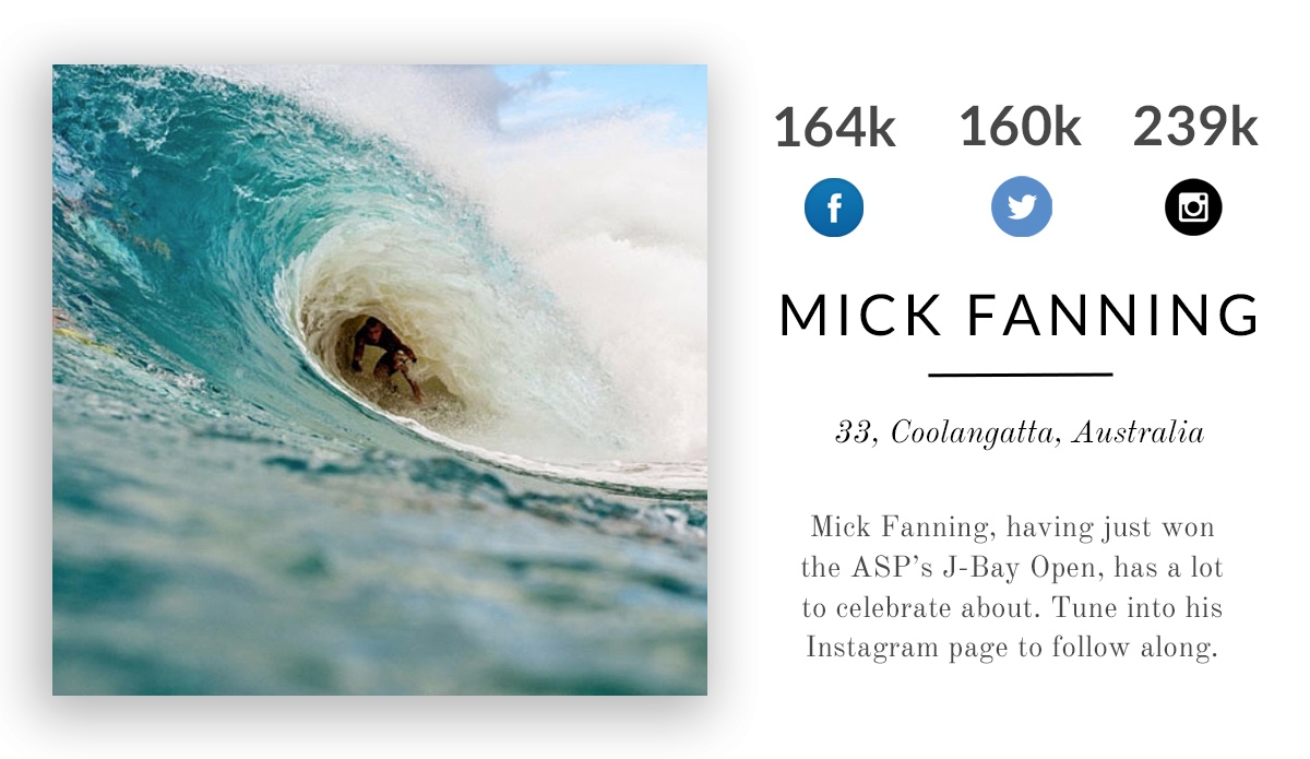 Mick Fanning, the current world champ. Having just won the ASP’s J-Bay Open, he’s got a lot to celebrate. Tune into his Instagram page to follow along.