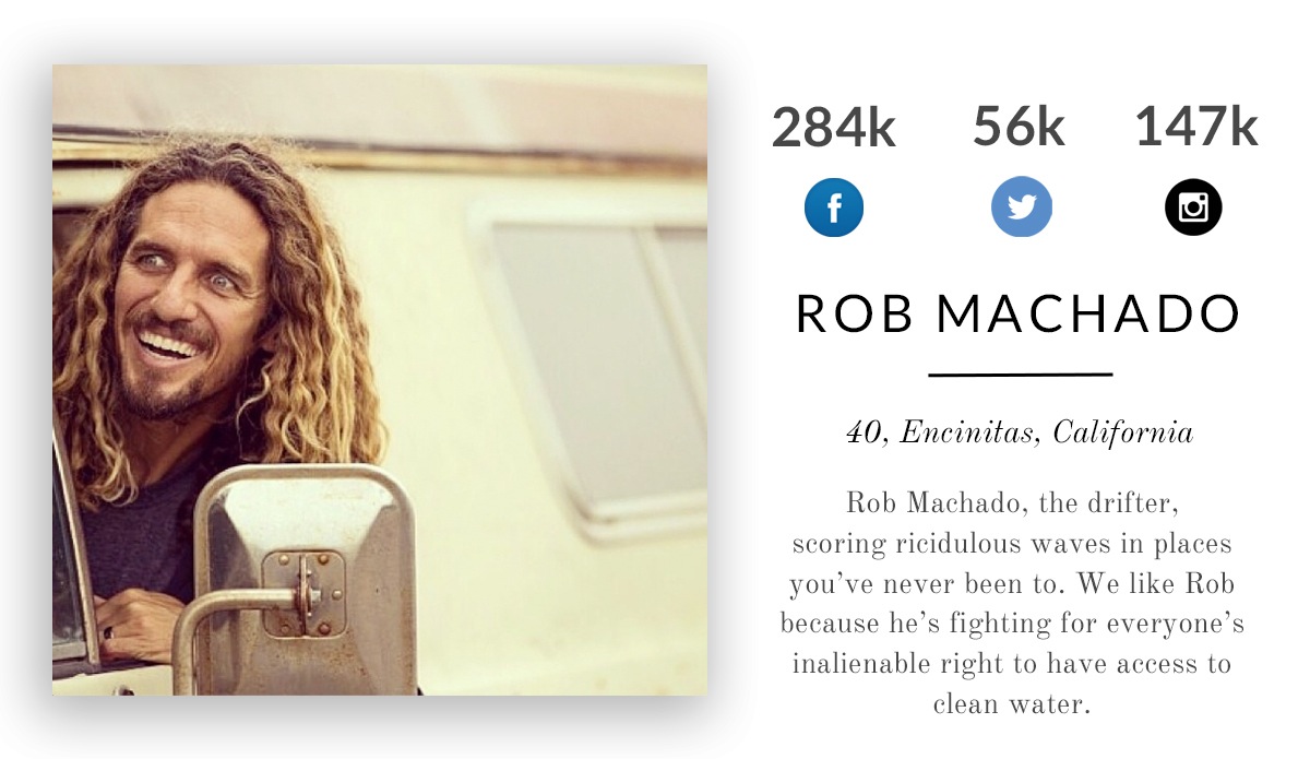Rob Machado, the drifter with that classic, laid-back style. We like Rob because he’s fighting for everyone’s unalienable right to have access to clean water.