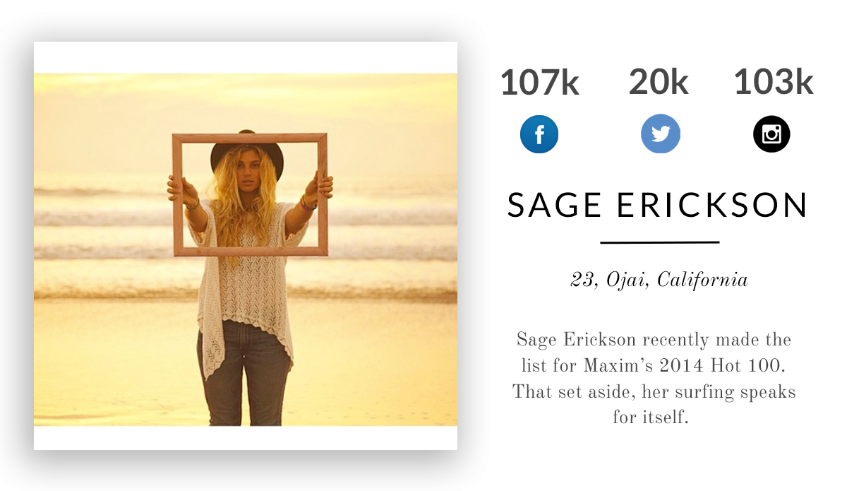 Sage Erickson recently made the list for Maxim’s 2014 Hot 100. That set aside, her surfing speaks for itself.