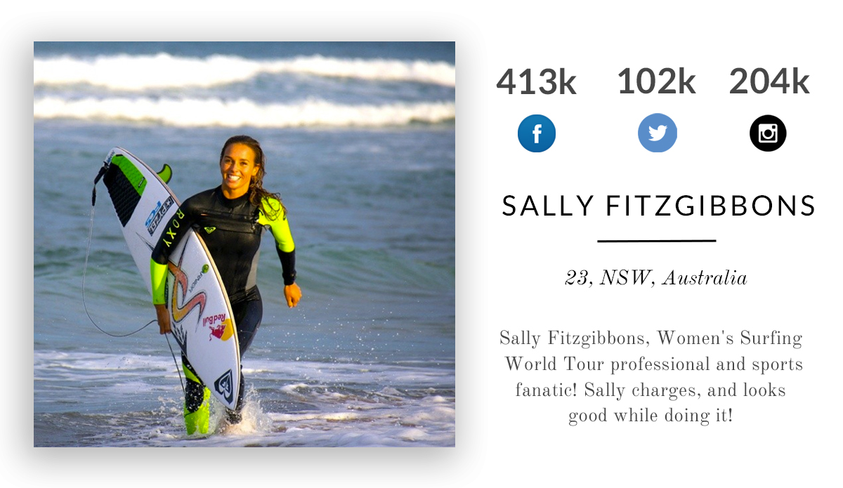 Sally Fitzgibbons, Women’s Surfing World Tour professional and sports fanatic! Sally charges, and looks good while doing it!