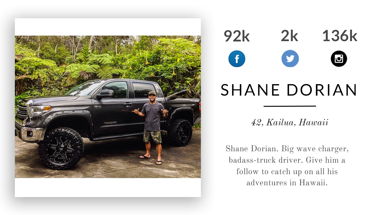 Shane Dorian. Big wave charger, badass-truck driver, bow hunter. Give him a follow to catch up on all his adventures in Hawaii.
