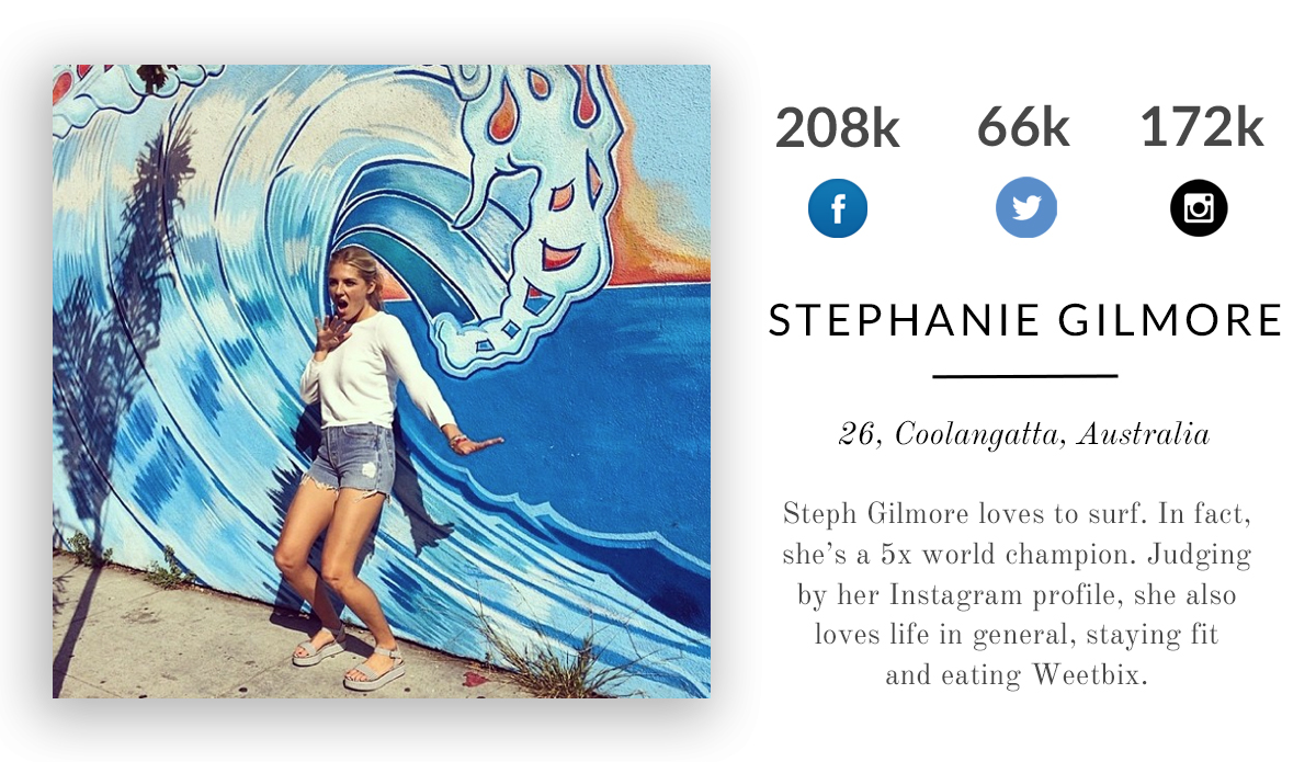 Steph Gilmore loves to surf. So much, in fact, that she’s a 5x world champion. Judging by her Instagram profile, she also loves life in general, staying fit and eating Weetabix.