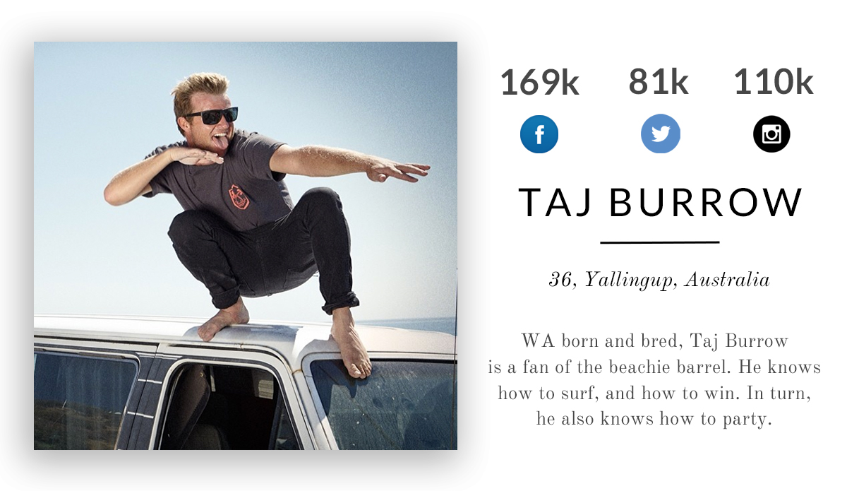 WA born and bred, Taj Burrow is a fan of the beachie barrel. He knows how to surf, and how to win. Due course, he knows how to party.