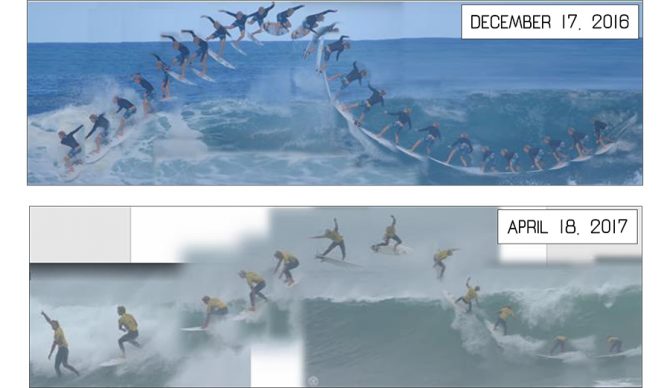 I realize and respect the many opinions out there about aerials. I’m only interested in the awe. Is it not awesome when a surfer and their equipment are able to collaborate so effectively? What really struck me about JJF’s move at Bells was how similar it was to one from a couple months ago. I wanted to take a more objective look at this recent feat of freakish talent and the alley-oop Florence pulled off at Backdoor last December. Both maneuvers look identical to the naked eye; JJF charging down the line on a long right and punting a big one. I was shocked though at how comparable the measurables actually were.