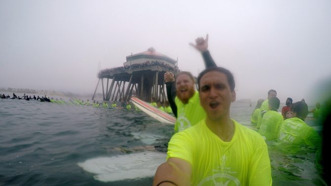 The details aren’t very exciting, so to keep it as short and sweet as possible, I was a very last-minute addition to the 511 surfers who paddled out past the Huntington Beach Pier, setting a new world record. With my highlighter yellow 2XL jersey and a handful of volunteers frantically reminding me to hurry I told myself, “Water’s been warm lately. Plus, this can’t take that long.” Opting to shave a couple minutes off my time by not slipping into a spring suit, I sprinted the five blocks from my car back to Main Street in boardshorts. Wrong choice.