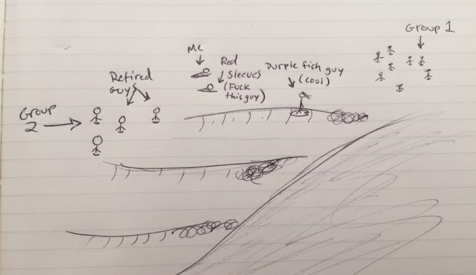 Now’s my chance. Here comes a wave and they’re distracted. Purple retro fish guy is paddling over the shoulder hooting me in. I knew I liked that guy. I drop in, get some speed, dig my rail and fall. I look around and a couple guys are looking at me. I scratch my wax as if I slipped. That totally only happened through no fault of my own. See guys. I slipped. See guys!