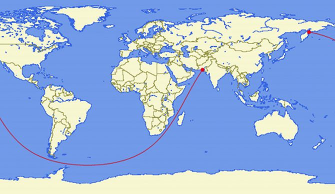 About five years ago, somebody mapped out what was theoretically the longest straight-line path man could sail around the ocean without ever touching land. They posted it to Reddit because that’s the kind of random place you keep such information. Recently, Rohan Chabukswar, a physicist at United Technologies Research Center Ireland, and Kushal Mukherjee, an engineer at IBM Research India in New Delhi, verified the path for the first time. And the interesting part of it all is that it’s a path that’s likely never been traveled — which means now that the word is out, the countdown has officially started for somebody to take the 19,940-mile trip between Pakistan and Russia.