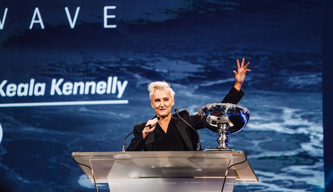 Keala Kennelly from her inspiring speech at the WSL’s Big Wave Awards in 2019. Photo: WSL / Sloane