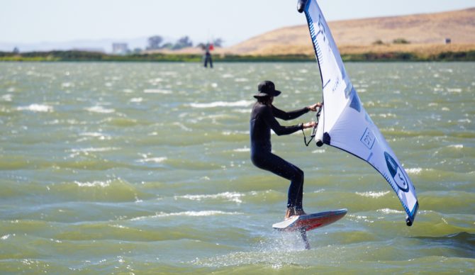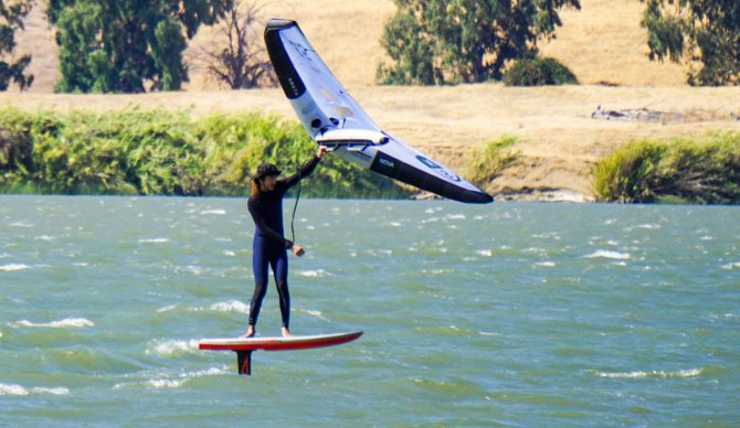 Midlength glide while wing foiling at Sherman Island. Photo: Ken Cox//The Inertia