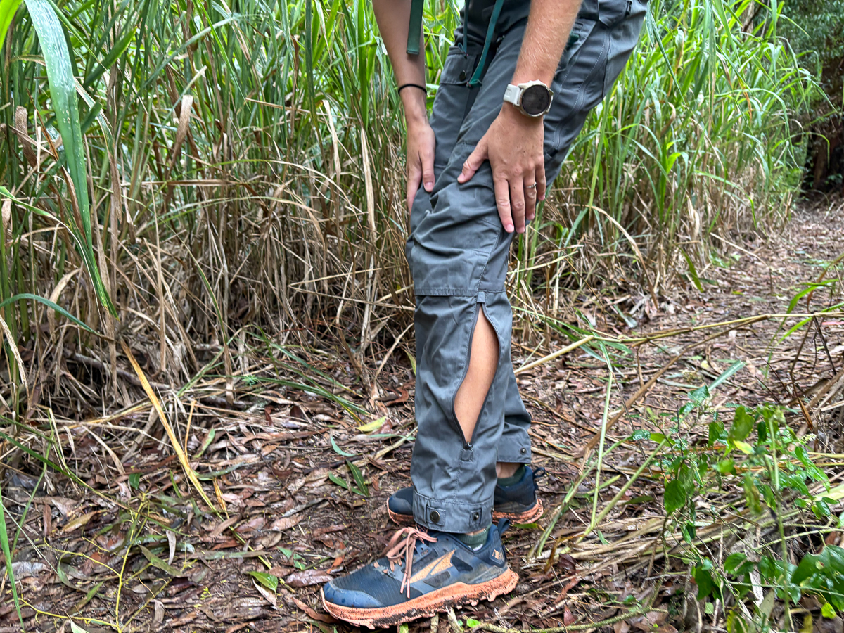 Some, but not all, of the pants on our list have adjustable ankle cuffs. We didn’t realize how big of a game changer these are until we got to testing. Adjustable ankle cuffs allow you to cinch your pants tight at the bottom, which we found to be extremely helpful when it was raining or through sections of trails that were especially overgrown. When you have your ankle cuffs tight, it helps prevent debris or water from entering your pants. The Cotopaxi Subo Pants are an example of a loose, lightweight pair of hiking pants with adjustable ankle cuffs.