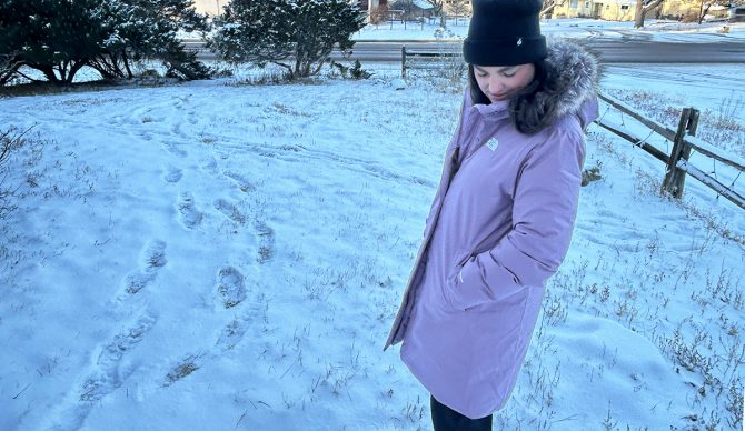 The matte lavender hue TNF calls “Grey Fawn” (more of a lavender than a gray or fawn, in my opinion) paired beautifully with the detachable fur ruff on the hood. The 600-fill recycled down felt incredibly plush and inviting. I also found the Sherpa-lined neck to be a nice addition. Weight-wise, the jacket felt a bit bulky. It was not the easiest to pack down, but I was ready to see how it would stand up to my winter-weather lifestyle.
