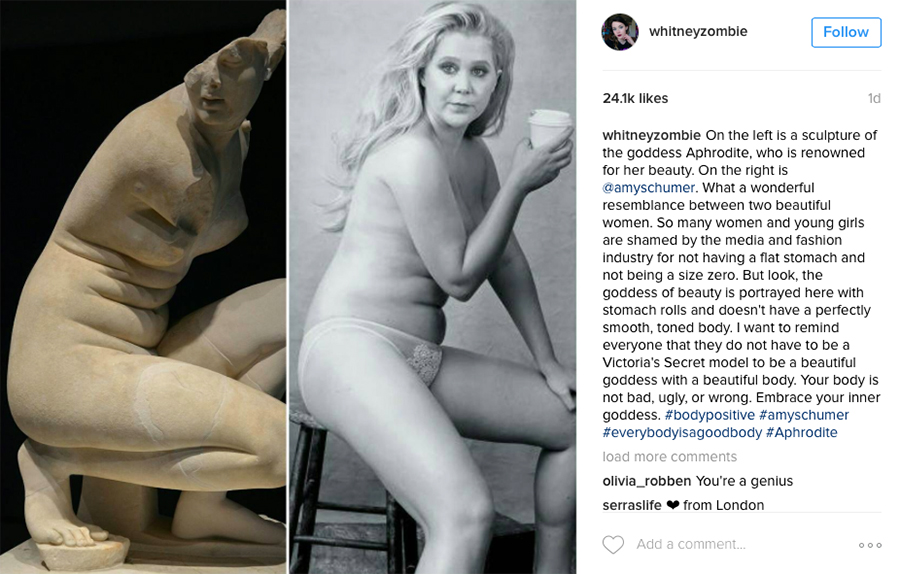 22-year-old psychology major, Whitney (last name Zombie?) took to Instagram to share her thoughts on Schumer’s body. The self-proclaimed feminist found a photograph of a statue of Aphrodite that happens to look almost identical to Amy Schumer. She juxtaposed a photo of Schumer in a similar pose, and the Internet pretty much lost its mind.