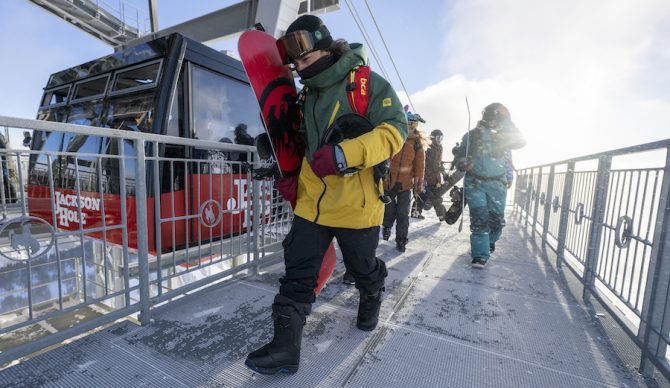 Despite Jackson’s status as a tourist destination, there’s an undercurrent of locals and dedicated shredders that keeps the resort grounded. Shoulder-to-shoulder packed trams had old friends greeting one another with conversations about gear, the snow, and favorite backcountry lines. On every ride as the tram reaches the top, the operator pauses the music and recites the speech about expert terrain and backcountry access, ending with “and if you don’t know…” to which the entire tram responds: “don’t go!” At the bottom of most lifts an old ski hangs with the shafts of broken ski poles dangling underneath. “They’re for good luck, hit them!” a 30-something snowboarder said to a ski school student I was lining up for a chair with, before reaching up to send them into an aggressive clatter.