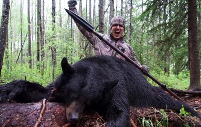 The video shows Bomar hiding behind a tree as a black bear eats from a 55-gallon barrel full of bait, a practice that is legal and commonly used by bear hunters in Canada. As the bear eats the bait, Bowmar steps out from the trees and throws his weapon from what looks to be around 20 feet. The spear seems to impact directly into the bears vital organs. As the bear runs, the spear is still stuck in it. Bowmar is filmed celebrating his success. Multiple cameras capture this video, even a spear-mounted video camera shows the spear’s impact, along with it falling out of the bear after a few steps. The bear is later recovered, having died from blood loss due to the gaping wound the large spearhead had torn in the animal’s flesh.