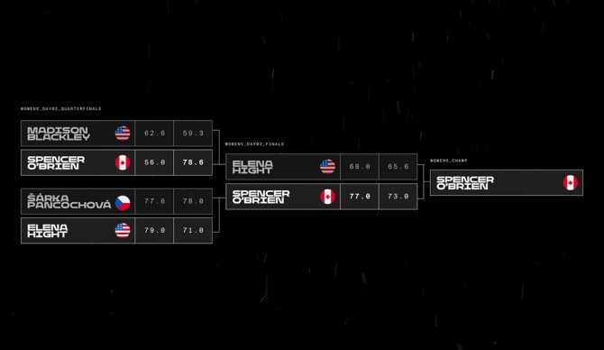 With the head-to-head, two-run format back on the table for finals day, O’Brien answered back with a stomped cab 5, a boned-out indy off a sizeable cliff and a few proper, surf-inspired powder hacks, posting a 77.3 on her first run that carried her through to victory.
