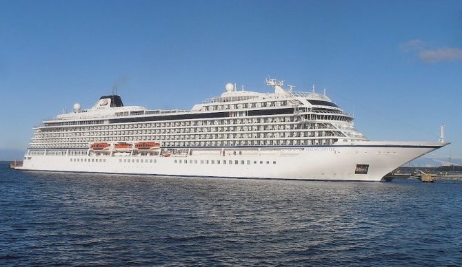 The wave hit the Viking Polaris last week, killing a passenger. Pictured: the Viking Jupiter in 2019. Photo: Pjotr Mahhonin//Wiki Commons