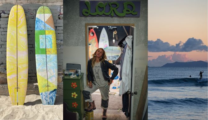 Lord has kept at the shaping craft since, and is completely self-taught through YouTube videos, books, blogs, and allowing the tools to guide her. She mentioned that it was difficult to gain confidence at first, but that process has since proven rewarding. “I was able to take ownership of my own process, not dependent on someone else’s approach,” says Lord. She’s now based out of Oceanside, Calif. under her label, Lord Bords. She told me that, “women often find shaping through art, which leads to a diverse point of view.” She comes from a New York and Los Angeles gallery scene and studio painting background, leading her to view her boards as an art form. She thrives off adding her own aesthetic, where she incorporates hand-painted foam, abstract foam stains, and 1970s-style fluorescent sprays to create colorful and energetic designs that are both fun to ride, and fun to look at.
