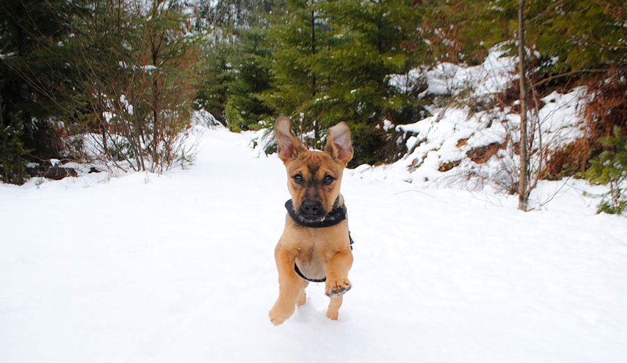 Ocho’s first time in the snow… it’s much colder than sand. Photo: Lindquist
