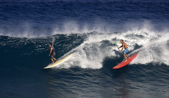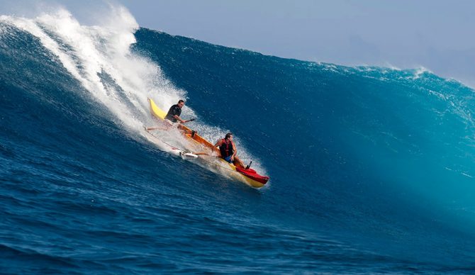 Loch and Dave Kalama canoe surfing Peahi. Photo: Darrell Wong