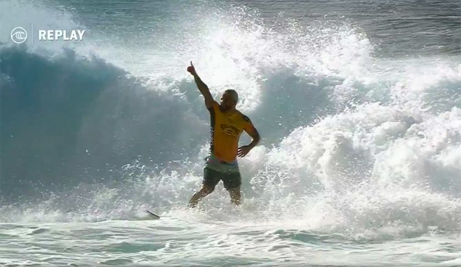 That momentum held up. Just inside 10 minutes to go, Ferreira extended his lead with a 7.73 and a single finger held up (no. 1?) as both an exclamation point and a reminder that Gabriel Medina’s mojo was gone. Medina held priority in the final minute of the heat needing a 7.80 that never came and Ferreira collected his first world title.