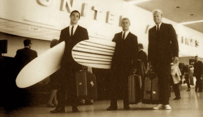 It’s kind of crazy when Robert August and Mike Hynson walk into LAX wearing suits, carrying their boards under their arms. Crazy because surfers didn’t wear suits. Back then. Photo: Encyclopedia of Surfing