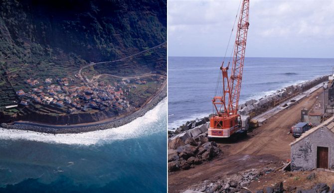 (L) Jardim do Mar, from the air. (R) Construction underway at Ponta Jardim. Photos: Save The Waves