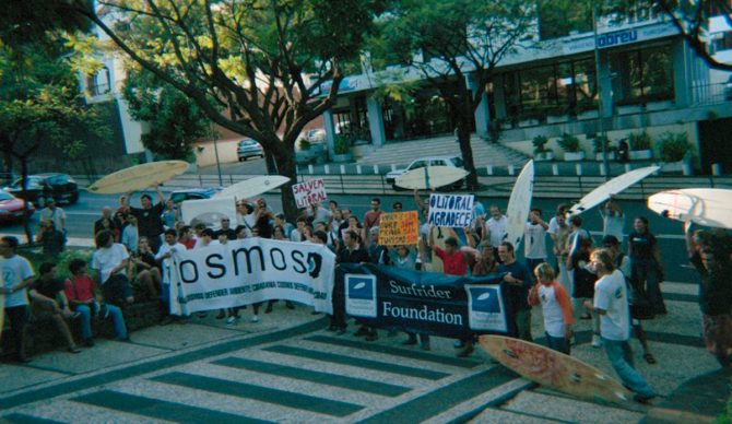 Our final effort was to hold a protest in the village of Jardim. The cameras were rolling as we arrived in the center square and attempted to set up our tables. With me were a number of visiting surf emissaries, as well as a few dozen local surfers. The townspeople who opposed us showed up in force, yelling, upturning tables, and ripping up our signs. As I raised a sign over my head, I was struck in the face. We were forced to retreat to the edge of town to regroup. What had turned violent, and had seemed initially like a failure, made national news back on the Portuguese mainland.