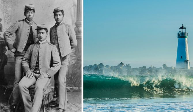 How: After their parents died, the three brothers of royal lineage were adopted in 1884 by the Hawaiian monarchs, King David Kalakaua and Queen Consort Esther Julia Kapiʻolani. Having learned to surf in Waikiki, the brothers traveled to Santa Cruz in 1885 to attend St. Matthews Hall military academy. Their boards were made out of local first-growth redwoods, milled in the shape of traditional Hawaiian o’lo boards and weighed around 150 pounds. Their efforts were widely reported and sowed the seed. A weekly edition of the Santa Cruz Surf paper from July of 1896 reported: “The boys who go in swimming at Seabright Beach and use surfboards to ride the breakers, like the Hawaiians.” While George Freeth’s exhibitions at Redondo in 1907 are often claimed as the start of mainland U.S. surf culture, it was the Hawaiian brothers who kick-started the craze.