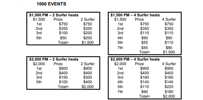 The key to the WSL pricing system is the prize purse of the events. The larger the event, the larger the prize money. Licensing fees are a derivative of prize money. They are 10% of the prize money total for the relevant event’s rating. And who decides how much prize money goes into an event’s relevant rating? You got it, the WSL. Prize money sums are detailed in Appendix C of the WSL rulebook and they are a fountain of knowledge.