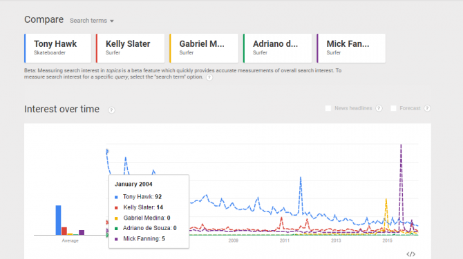 Going over international search results for surf athletes from 2004 to the present, only one name registers significantly into the statistics. Can you guess who? Yes, Mr. Robert Kelly Slater. The current big three (Fanning, Medina, and de Souza) hardly make any impression on global search results with these three exceptions: Mick had a huge spike wrestling a shark, Medina and ADS had smaller spikes in search statistics when they won their world titles, and even Slater is insignificant compared to fellow extreme superstar Tony Hawk.