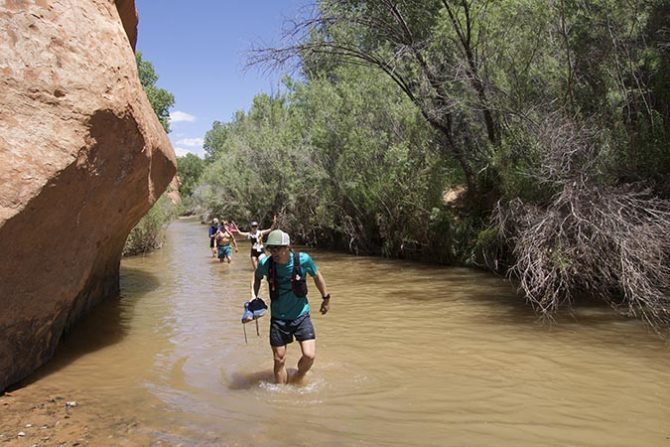 Grand Staircase-Escalante is an endless playground to explore. While we were chomping at the bit to hit as many miles of trail as we could, we all felt the sense that we should dial back the miles in exchange for connecting more with the local community. We changed routes on Day 2 and met up with a rag tag group of runners who were inspired to show solidarity for the monument. The group included local trail enthusiasts, folks passing through town, a modern-day survivalist who lives off the land (and ran us into the ground), and even a bachelorette party. We split into two groups and ran in opposite directions along a 15-mile stretch of the Escalante River, fording it 30 times along the way. Our shoes were soaked, legs torn up from the faint trail system that often led straight into thickets of brush, yet we barely saw anyone else amidst the awe-inspiring sandstone cathedrals.