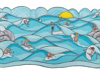 My work involves vibrant colors and stylized characters. I work with acrylics, paint pens and spray paint. I do surfboard art, murals and design work.