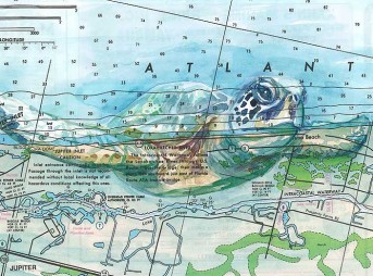 Carly Mejeur is a Lantana local artist. She was born and raised in South Florida but moved to Baltimore to attend the Maryland Institute College of Art and receive her BFA in painting. She was a seasonal lifeguard for Palm Beach County Ocean Rescue throughout her college career and knew that, eventually, she wanted to return home for good. After gaining her Masters in Art Education, Mejeur and her husband, (also a native Floridian) moved back to Florida where she accepted an art teacher position at the Palm Beach Maritime Academy. It just so happened that Marine Science and conservation is the over-arching theme of this Palm Beach County Public Charter School. Blessed with a constant source of inspiration from her surroundings and hobbies, Carly strayed from her academic oil paintings of portraits and figures and began experimenting with watercolor and marine life. After an abundance of maps somehow made their way to the Mejeur household from several friends, she took it as a cue to explore the medium. Her first Octopus, designed to fill an empty wall in her own home, became the official catalyst for the nautical chart series. Now she is showing and selling several in the series at local businesses and art festivals.