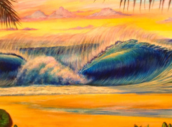 Painter, sculptor, muralist, Hawaii-born artist Clark Takashima loves his job. He's been painting surfing waves for 37 years. His father taught him how to draw at age 5 when he wanted to portray everything he saw and experienced from air shows to animals at the zoo to deep sea fishing. Once Clark began surfing at age 13, there was one thing running through his brain waves: waves! So he painted them...constantly. His passion and dedication through the years has paid off, and his works now grace many walls – not only within the surfing world but the world at large too. In 2007, while painting over an already varnished piece, Clark accidentally discovered how translucent color over the clear surface captured light and developed his own technique of acrylic paintings which he calls "the layered glaze" technique. Clark explains, "By applying layers of clear glaze between translucent layers of paint, allows light to penetrate the layers below. This allows for color mixing to happen in varying lighting conditions on the canvas itself. Depending on lighting, daylight, afternoon light, or indoor lighting, the look and colors of the paintings morph. I'm now adding iridescent pigments and adding textures which gives the work a new dimension." Aside from developing his own techniques, Clark is dedicated to cultivating the relatively new genre of surf art. "I was inspired by meeting Clark Little and Heather Brown in 2006. We were all beginning our public careers and we shared information on how to market our work." Competition was not a factor. Collaboration, hard work, and aloha were the keys to success.
