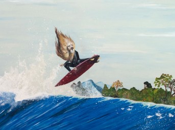 Kate Barattini is a lively young woman from Charleston, SC. As an admirer of the animate yet slow-paced rural living, she highlights the souls of plant, human, and animal life with a realistic approach bound with graphic detailing. Her most recent endeavor has been Animal Shred, a series of 10 paintings that reveal the animal soul of surfers by illustrating their human beauty in conjunction with expressive animal heads. It is a series that derived from a cheeky passion for animal personification and her love of the surfing world. She graduated from the College of Charleston in South Carolina with a Geology degree but has studied visual art from a very young age. With a successful artist as a mother and an early education met with devoted art instructors who worked with Kate one-on-one honed her natural skills and granted her the confidence to explore her talent. Her works have been featured in Austin, TX, Charleston, SC, and Charlotte, NC. She is sure to continue painting with the sole intention of spreading a heavy dose of stoke. See more from Kate on Instagram and on Animalshred.com