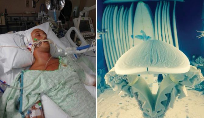 Steward was in a coma for 18 days. His parents were called to the hospital three times to say their final goodbyes to him. His heart beat was almost at a flatline. Through heroic help from a friend and a miraculous surgery that replaced half of his skull, Steward had a new appreciation for life. When he recovered, he quit his job as a financial advisor and went out on his own to create the lifestyle, apparel, and surfboard brand Flatline Surf Co.