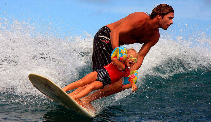 Sion Milosky surfing with his daughter. His tragic death at Maverick’s in 2011 is just one of the many lives lost to big-wave surfing. Photo: Jamie Ballenger