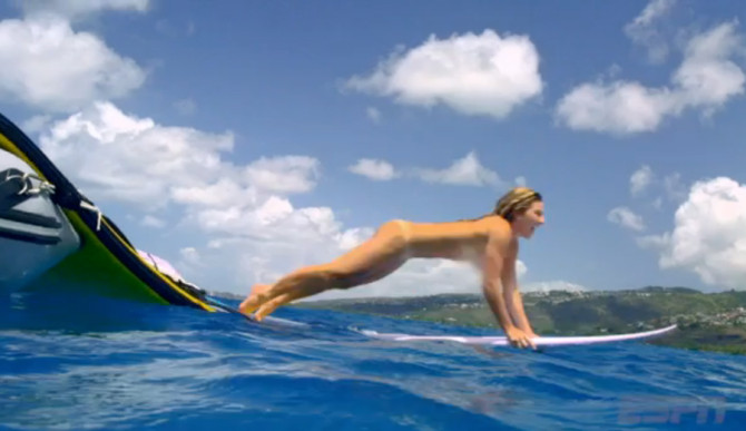 The shoot was as mellow as a production this big could be. We had a really great crew on a boat, zodiac, and jet skis! ESPN has been doing the issue for quite some time now and had everything dialed; I felt really comfortable. Most of my shoot was in the ocean so I had my board for protection — haha — but it wasn’t too bad. I couldn’t imagine being nude straight on in a studio… now that seems awkward!