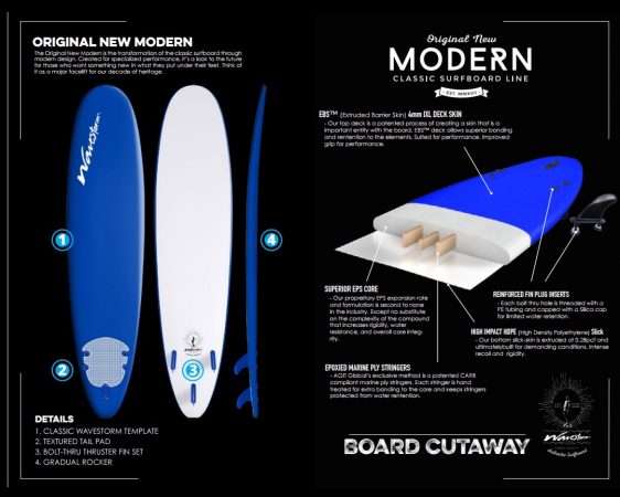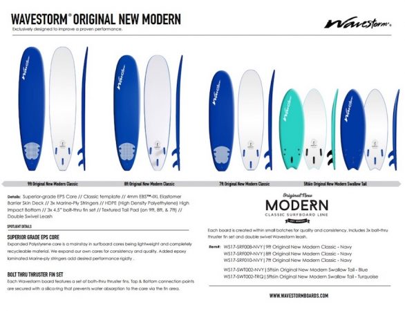 The “Original New Modern” line, besides being a string of three contradictory adjectives, will come in a 9ft, 8ft, 7ft and a 5ft 6″ swallow tail. All models boast a more durable skin that makes them a touch grippier, which they call an “Elastomer barrier skin deck.” Water won’t get stuck in the fins as easily either with the addition of plug inserts that are water sealed to protect the board from gradually gaining 50 pounds of water weight. These plugs also make for harder turns and faster speeds.