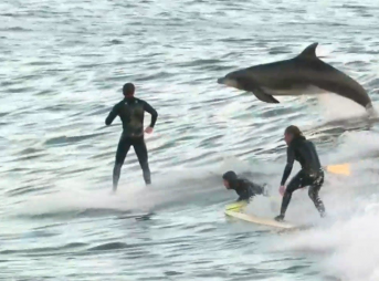 Rincon Party Wave: A Pod of Dolphins, a Surf Mat, and Two Surfers