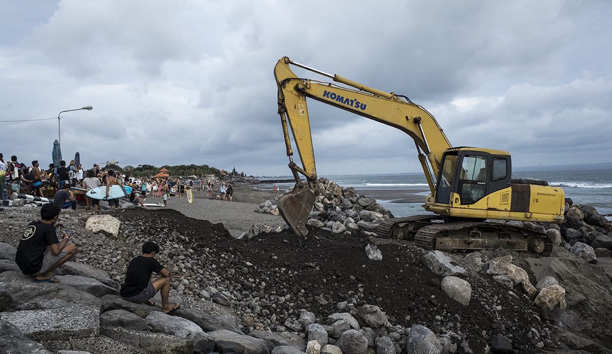 We quickly hustled across the back alleys that lead to Pererenan beach, and there it was. In full flight, a bulldozer actively piling rock upon rock forming a new jetty, with the hallowed rocky sand bottom peak of Echo Beach only 100 meters away.